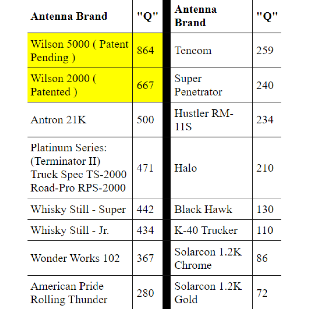 The Wilson 5000 Trucker CB antenna was shown to have the highest “Q” rating of all antenna coils tested. The “Q” is the standard engineering measurement of efficiency of the antenna coil. The higher the “Q”, the higher the efficiency, which means higher performance from that antenna.