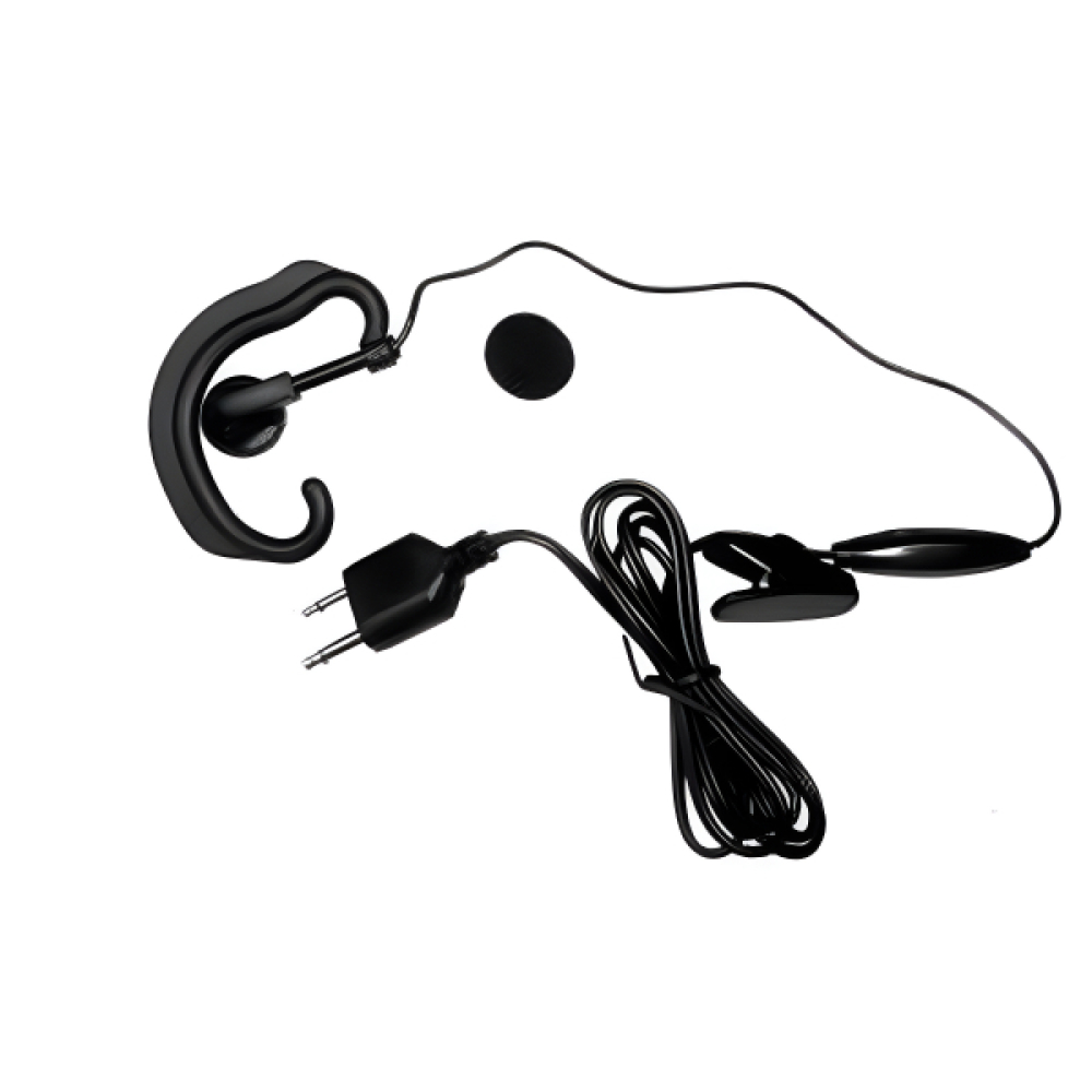 This handy unit wraps around your ear and has a soft cushion ear bud. Inline with the cord there is a PTT button and Microphone as well as a lapel clip.