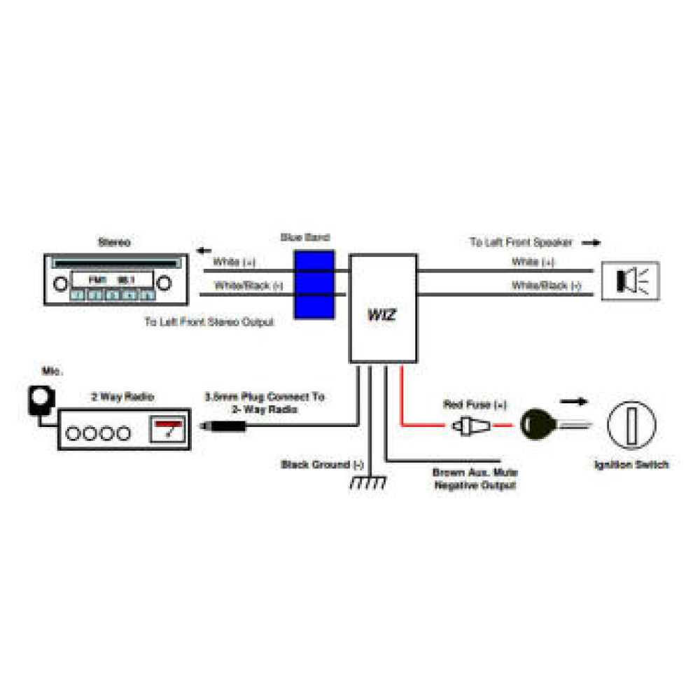 The Wiz is an effective 2-way radio voice-activated left front speaker switch and left front stereo output mute device that allows seamless and fully automatic interaction between the vehicle stereo and a scanner or other radio receiving device equipped with a mono 1/8” (3.5mm) speaker output jack such as on a GPS, CB, FRS, GMRS, VHF, UHF, Ham Radio or Radar Detector.